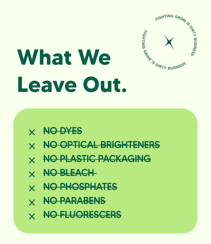 必要な成分だけで作られており、漂白剤、リン酸塩、染料、その他の不必要な化学物質を使用していません。さらに、プラスチックフリーのパッケージでお届けします!
